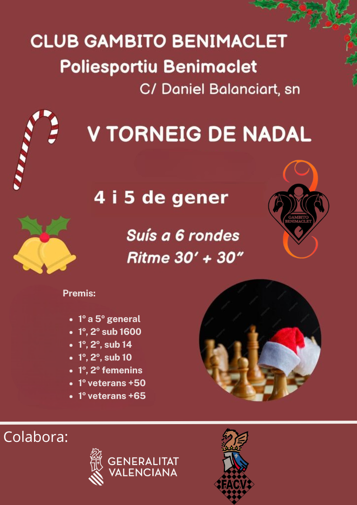 El pasado 21 de diciembre, la Casa de la Cultura de Benimodo acogió el torneo conmemorativo del 35º aniversario del Club d’Escacs Benimodo, y el C.E. Gambito Benimaclet estuvo brillantemente representado por el Maestro FIDE Javier Buenafé Moya, quien logró un destacado segundo puesto en este competitivo evento. El torneo fue ganado por Carles Mellado, […]